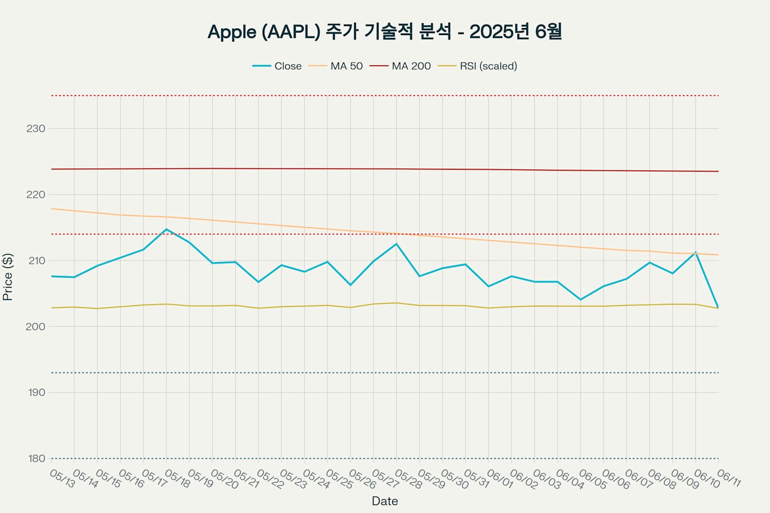 현재 Apple 주가는 기술적으로 약세 구간에 위치하지만, 강력한 재무 구조와 다양한 성장 동력을 바탕으로 중장기적 상승 잠재력을 보유하고 있습니다.