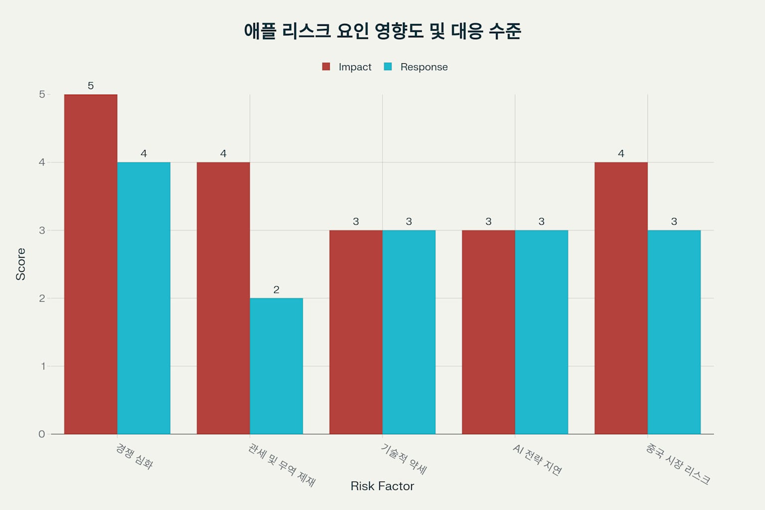 SEC 보고서에서 식별된 주요 리스크 요인들을 영향도와 대응수준에 따라 분석한 결과, 경쟁 심화가 가장 높은 영향도(5점)를 보이며 Apple의 대응 수준도 상대적으로 높은 편입니다. 특히 관세 및 무역 제재는 높은 영향도(4점)에 비해 대응 수준(2점)이 낮아 즉시 대응이 필요한 영역으로 분류됩니다.