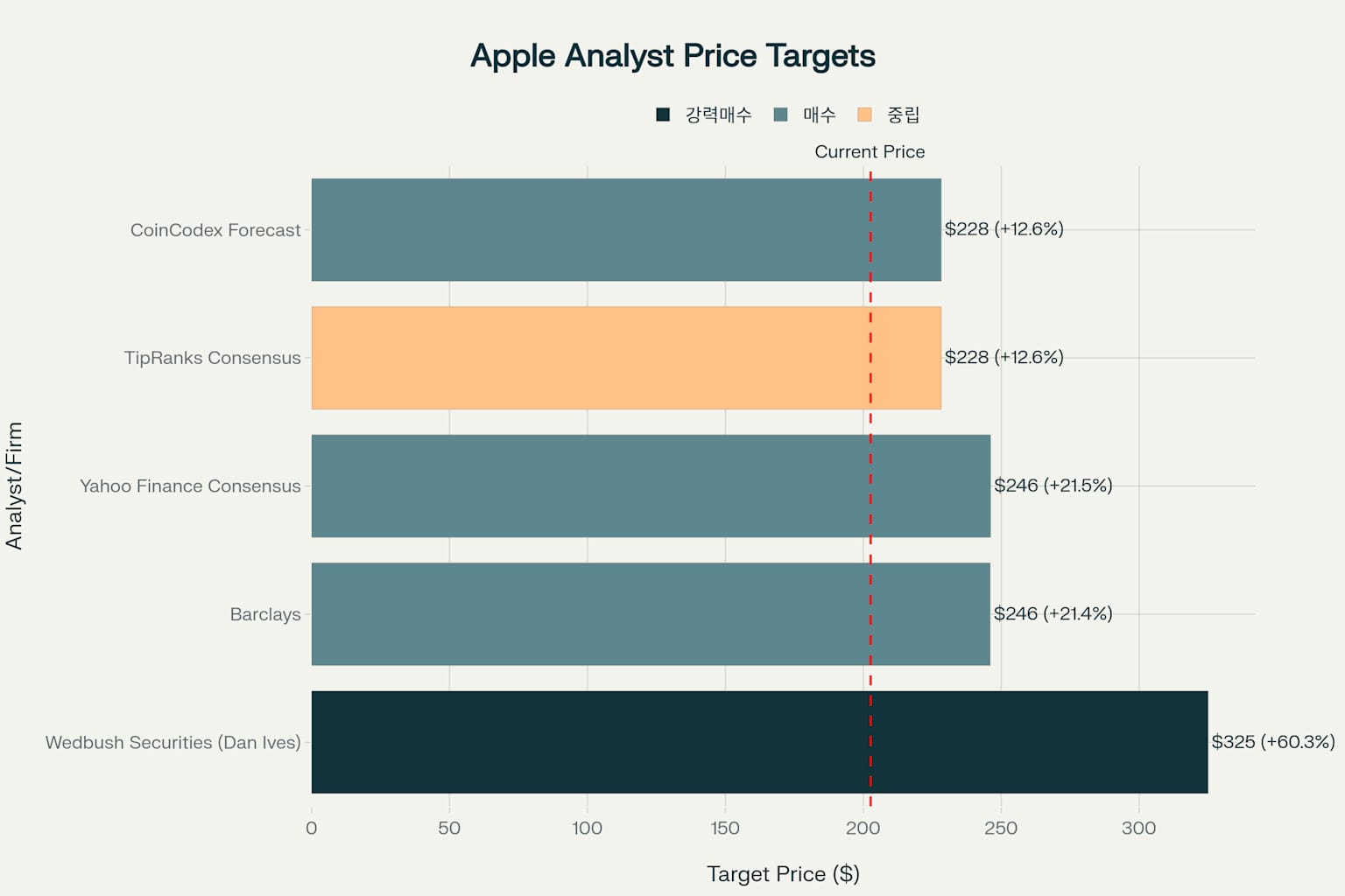 주요 분석가들의 Apple 목표가는 평균 $246.14로 현재 주가 대비 21.5%의 상승여력을 제시하고 있습니다. Wedbush Securities의 Dan Ives는 가장 강세 전망으로 $325 목표가(상승여력 60.3%)를 제시하며 강력매수 의견을 유지하고 있습니다