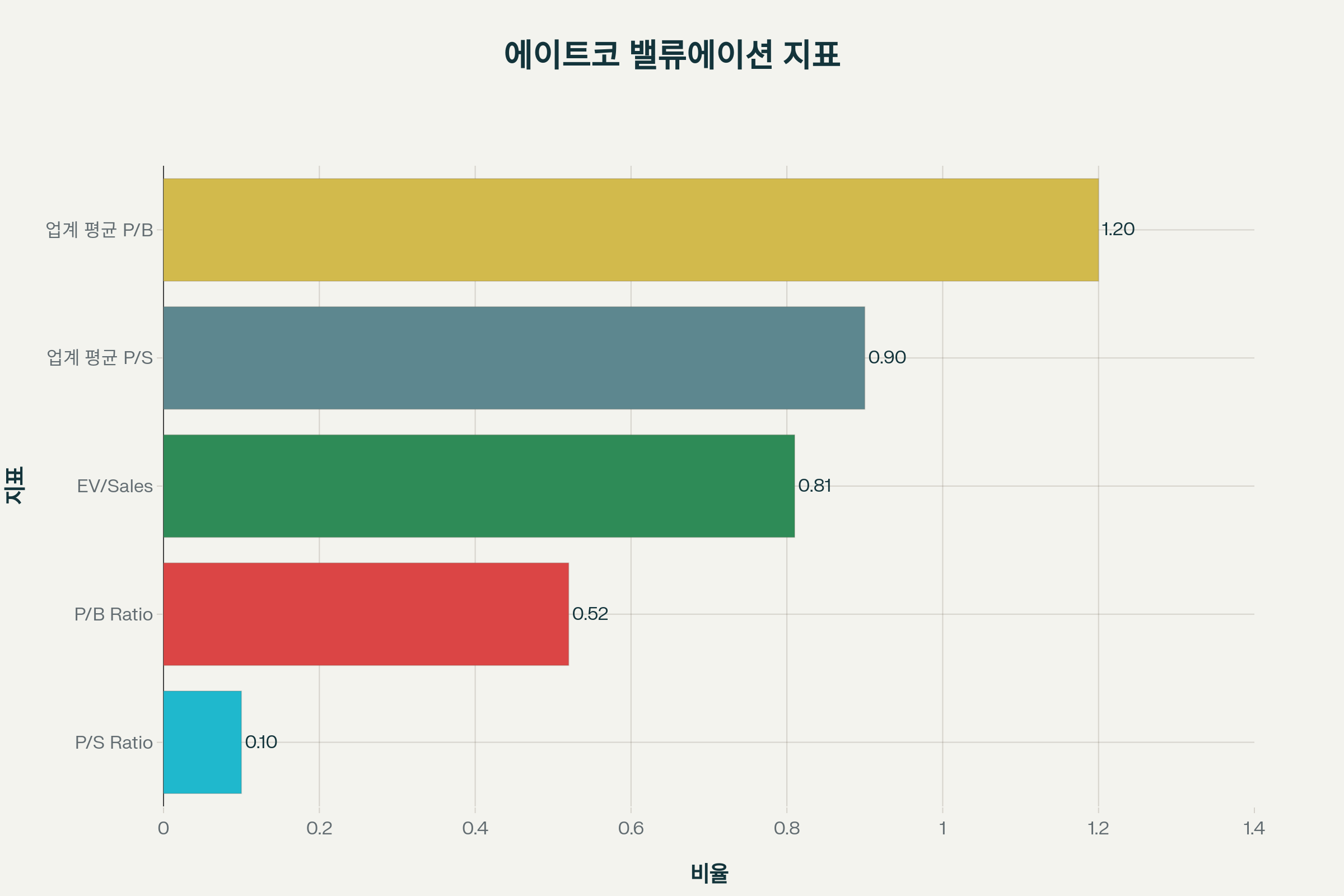 급등 이전 에이트코홀딩스의 밸류에이션은 극단적으로 저평가 상태였습니다. P/S Ratio 0.1배, P/B Ratio 0.52배, EV/Sales 0.81배로 동종 업계 평균을 크게 밑돌았습니다. 시가총액이 441만 달러에 불과했던 소형주가 하루 만에 시가총액 수십억 달러 수준으로 급등한 것은 재료의 파급력을 보여주는 극단적 사례라고 볼 수 있습니다.