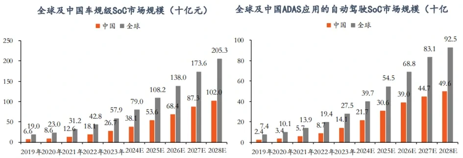 자동차 반도체 시장은 2023년 3,550억위안에서 2030년 6,000억위안 이상으로 커질 전망이고, 그 안에서 차량용 SoC는 2023년 중국 267억위안(CAGR 42%) → 2028년 1,020억위안으로 가장 빠른 성장 축이다. ADAS SoC는 2023년 중국 141억위안에서 고성장 중이며, ADS SoC는 2030년 중국 257억위안 규모로 고가·고부가 영역을 형성해 중국이 최대 증분 시장이 될 가능성이 크다.