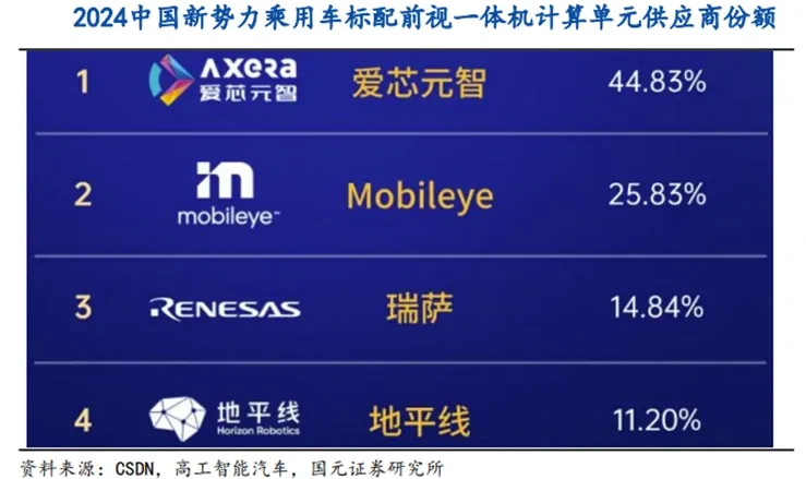 소형 SoC(2.5~20TOPS)는 전방 카메라·기본 ADAS(L0~L2)용으로 중국에서는 이미 로컬이 주류다. 지평선 정청J2/J3(4/5TOPS)는 Mobileye EyeQ4보다 높은 연산력·개방성을 제공하면서 가격은 절반 수준으로, 2024년 기준 신생 OEM 전방 카메라 SoC 점유율이 50%를 넘는다. 아이신위안즈·지평선이 공급하는 전방 일체형(前视一体机)만 2024년 1,080만세트, 침투율 47.15%를 기록했다.