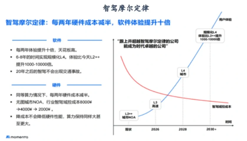 코스트 측면에서는 센서·SoC·플랫폼 비용이 빠르게 하락하며, Momenta 기준 “2년마다 하드웨어 반값, 소프트웨어 성능 10배”라는 경험칙이 작동 중이다. 이 흐름이 10~15만위안급에서도 L2+/도심 NOA를 가능하게 만들어, 소형·중형차까지 중·대형 SoC 수요가 폭발하는 구조다.