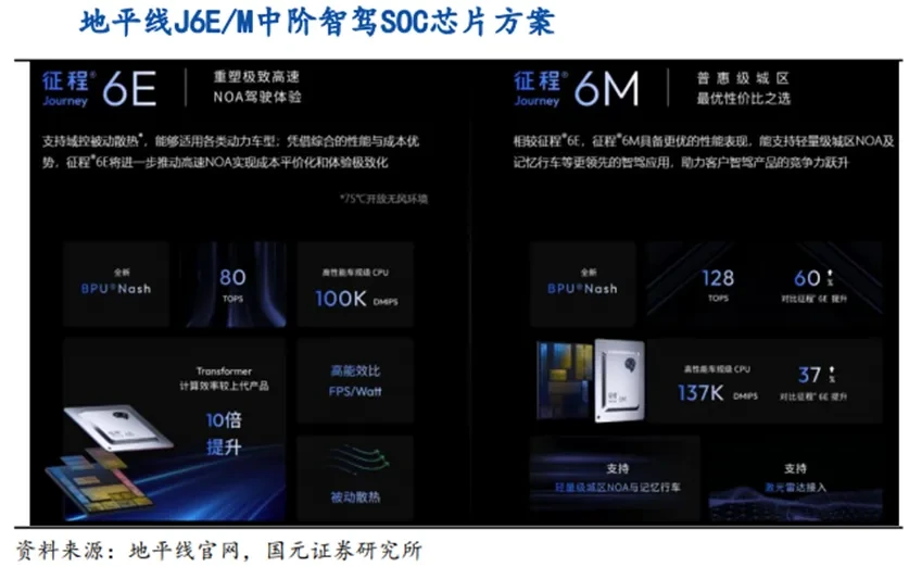 중형 SoC(20~80TOPS)는 15~20만위안급 L2+/고속 NOA용으로 “지능 주행 평권”의 핵심 영역이다. 2025년 들어 지리·창안(长安)·비야디·치루이(奇瑞) 등 다수 모델이 지평선 정청J6E/M을 채택하며, 알고리즘·생태·서비스 기준으로 국산 SoC의 체감 경쟁력이 빠르게 올라가고 있다.