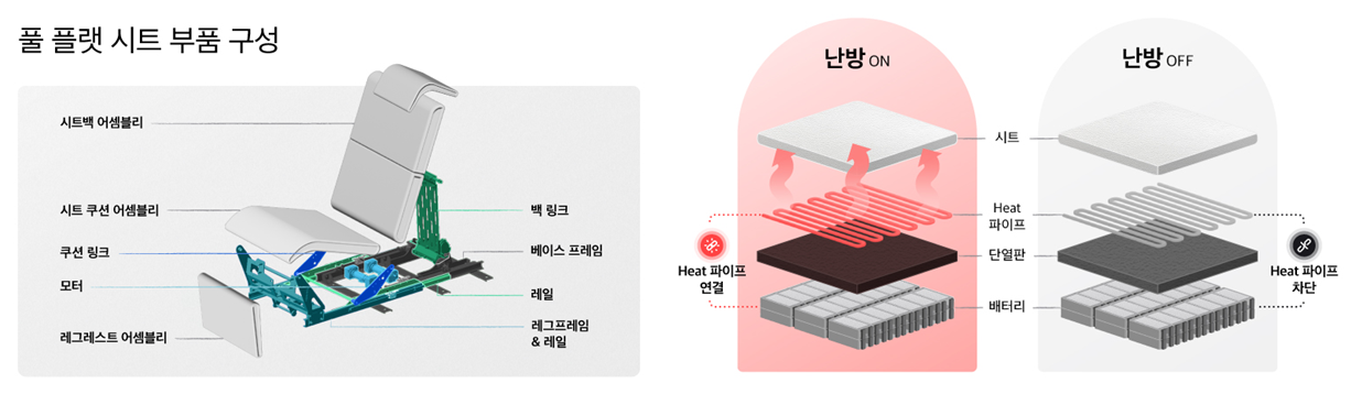 첫번째는 이동안전을 고려한 풀플랫 시트 ㅎ 맞다 비지니스 클래스 이상에서 누워서 가는 그 경험이다. 그렇게 된다면 기존보다 더 넓은 실내 공간을 활용할 수 있고 그곳을 더 활용할 수 있다는 컨셉이다. 두번째는 이른바 온돌 이름에서 짐작가능하듯이 난방이 다르다는 것이다. 배터리 잔열을 이용하고, 발열체를 통한 난방을 적용해 공기를 직접 가열하는 방식이 아니라 우리의 온돌처럼 만들겠다는 것이다 ㅎㅎ 놀라운 사실은 여기 적용한 발열체는 흡음재와 단열재 역할을 동시에 수행가능하다는 것이다. 띠용!