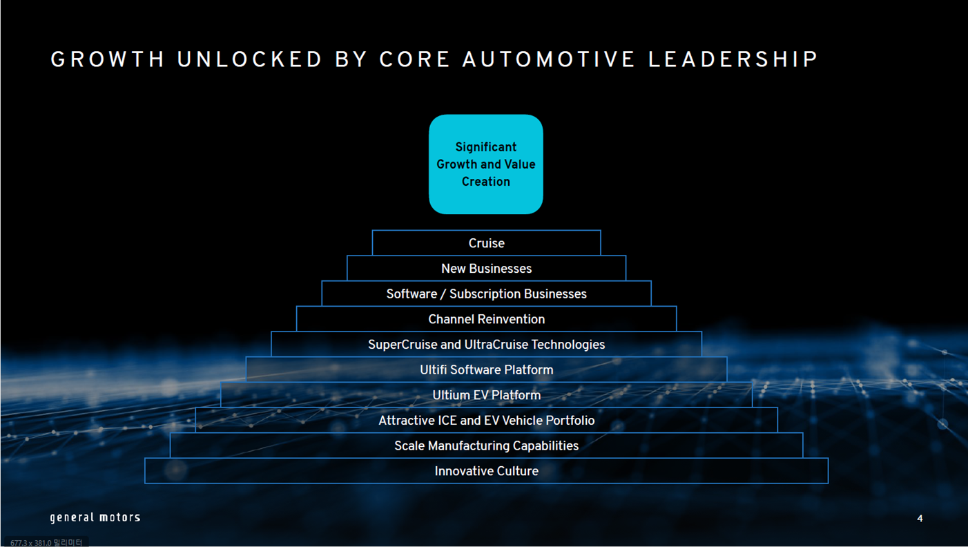 GM은 단독으로 1천만 대 이상의 플랫폼 투자 여력이 부족한 상황이다. 연간 800만대 매출 규모에서 실제적으로 더 성장하기는 어려운 상황으로 영업이익률도 High single을 유지하기도 버거운 상황이다. GM의 계획을 들여다 보면 차량용 OS도 모든 것을 통합하기 보다는 자체 얼티파이 SW플랫폼에다 인포테인먼트는 구글OS를 통합할 계획이다. 제조 판매 중심의 매출 구조에서 Cruise, New Biz, SW / Subscription biz에서 현재 온스타 매출 20억 달러에서 향후 200~250억 달러를 목표로 하고 있다.