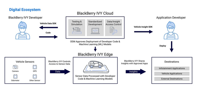 IVY는 특정의 자동차 메이커에 얽매이지 않고, 여러 자동차 메이커에서 공통으로 사용할 수 있다는 전제로 자동차 제조사는 IVY로 모은 데이터를 사용해 인공지능을 학습시키고 학습한 인공지능을 차량에 탑재할 수 있다.이때 데이터를 자동차 제조사 간에 공유할 수 있다면 인공지능 학습 정확도를 높이거나 사용자 규모를 키워 데이터 플랫폼으로서의 매력을 높일 수 있다. 향후 자동차 메이커, 블랙베리, AWS 사이의 계약 구조나 협업 방식에 대해서 지켜봐야하는 대목이다.