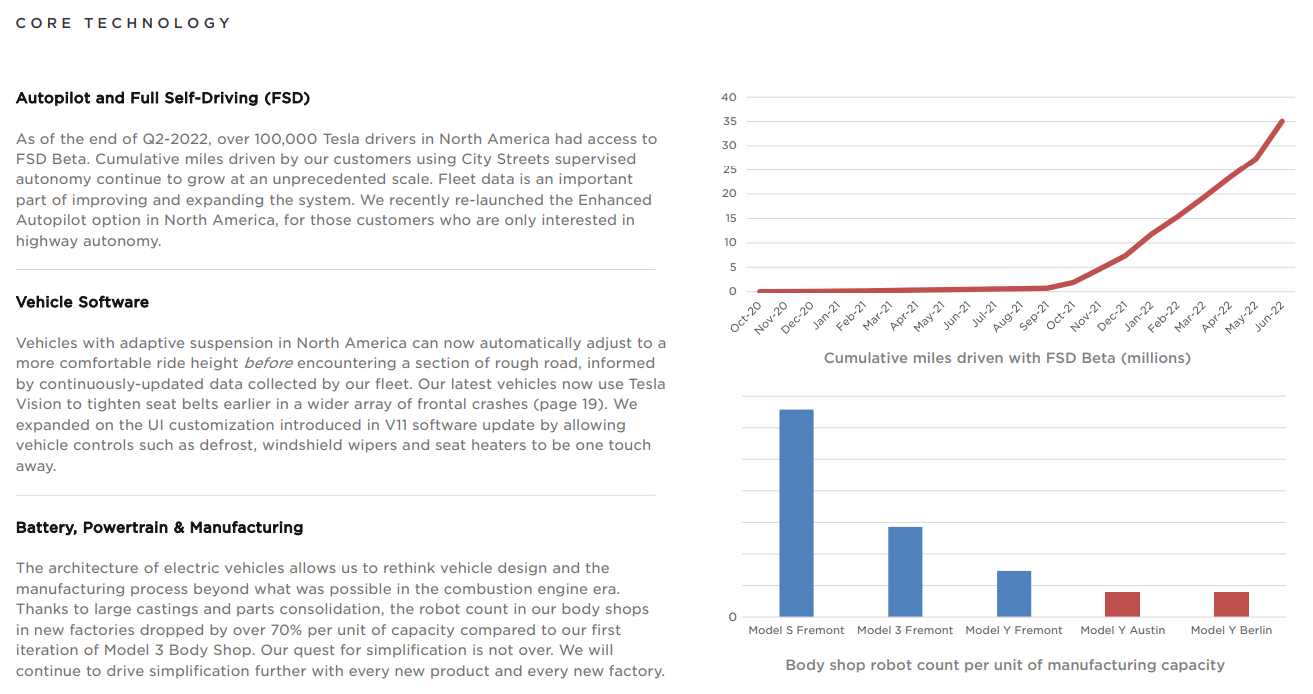 100,000명 이상의 소유자에게 City Streets 주행 기능이 있는 FSD 베타를 배포했습니다. 이제 FSD 베타로 3,500만 마일 이상을 운전했습니다. 그것은 우리가 알고 있는 어떤 회사보다 더 자율적인 마일입니다. 제 생각에는 아마도 다른 모든 회사를 합친 것보다 더 많을 것입니다. 따라서 그 마일리지는 기하급수적으로 증가하고 있습니다. FSD 베타는 올해 말 이전에 모든 북미 고객을 대상으로 출시될 예정입니다. 그리고 규제 승인을 받으면 유럽과 세계의 다른 지역에서도 출시할 수 있기를 바랍니다.
