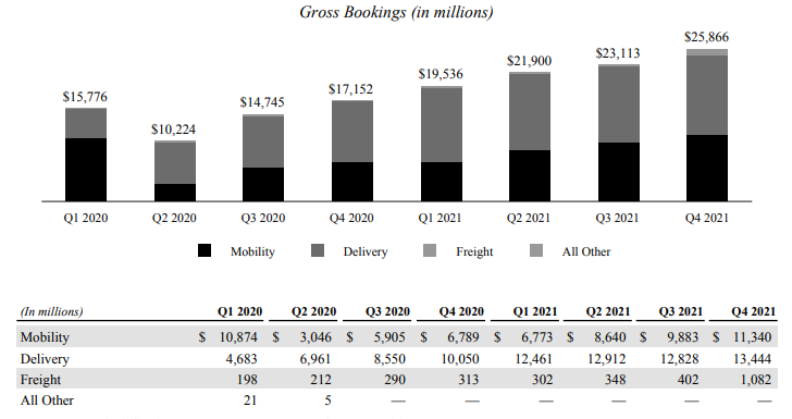 잠시 우리 기억 속에서 잊혀져 있던 우버가 다시 살아났다. 2021년 4Q 총 예약 수는 전년 동기 대비 51%증가했고 분기 총 이용 금액은 3조원을 넘어섰다 .배차 서비스와 푸드 딜리버리를 다 합친 금액이다. 배차 서비스가 절반이 약간 안되고 푸드 딜리버리가 절반을 넘는 숫자를 기록했다.
